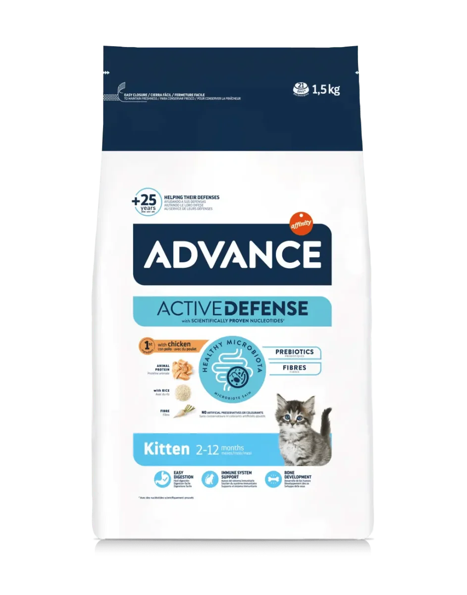En Advance elaboramos nuestras recetas con ingredientes de alta calidad para garantizar una buena nutrición. Nuestra receta Kitten está elaborada con pollo como primer ingrediente, que incorporamos a la receta sin procesar previamente, y que cocemos en su propio jugo. El pollo es una excelente fuente de proteína y aminoácidos esenciales para el mantenimiento de tejidos y una buena musculatura.