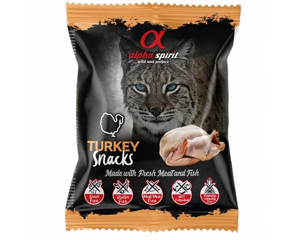 ALIMENTO COMPLEMENTARIO PARA GATOS. Los SNACKS para gatos de ALPHA SPIRIT están hechos con ingredientes naturales y con un toque necesario de taurina. Recompense a su gato con pequeños trozos de vitalidad, recompénselo con un espíritu alfa. Pequeñas porciones de esencia. Pequeños mordiscos de su identidad. Pequeños recuerdos salvajes.