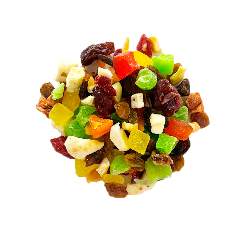 Mix de fruta seca deshidratada y cortada en pequeños pedazos, excelente como botana rica y nutritiva lista para consumir.