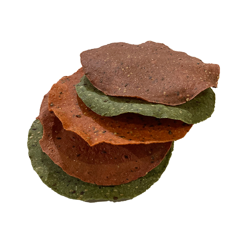 Tostadas horneados a base de maíz nixtamalizado y harina de maíz con diferentes sabores que le dan una un toque original, nutritivo y delicioso: zanahoria con cúrcuma, nopal con espinaca y betabel con Jamaica.