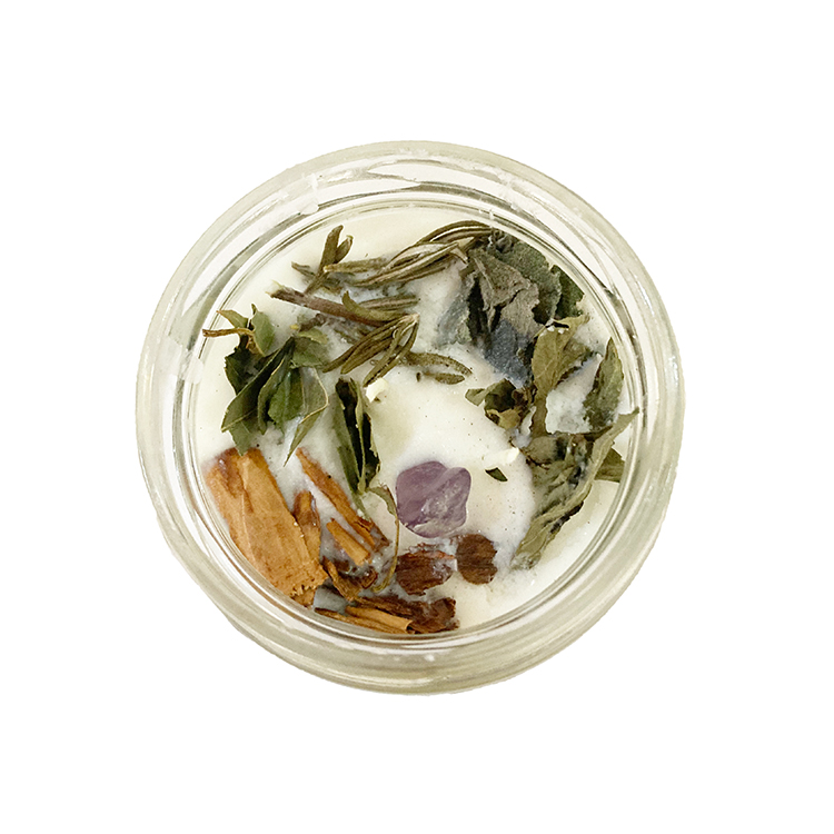 Hecha a base de cera de soya acompañada con un cuarzo amatista, canela, laurel, romero, albahaca y salvia. Cada ingrediente pensado para que al encenderla se iluminen tus intenciones y se abran caminos a metas específicas.